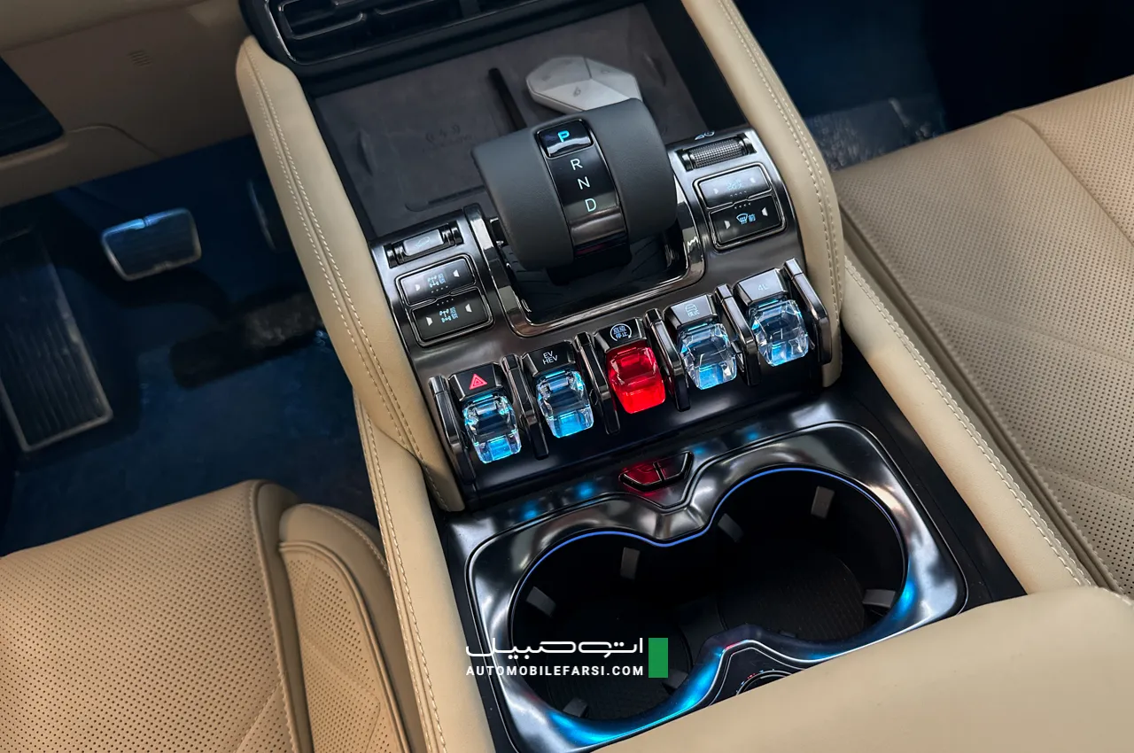 بقیهی عناصر کابین اما پیچیدگی خاصی ندارند که البته تا همین جایش هم برای یک خودروی آفرودی به اندازهی کافی شلوغکاری شده! دستگیرهی روی داشبورد اشارهای دلنشین به تواناییهای آفرودی خودرو است و سطح مشکی براق هم از لحاظ کیفیت احساس خوبی را منتقل میکند و هم تضاد ملایم و دلنشینی با رنگ کرم بخشهای پایینی داشبورد و رودریها دارد؛ ضمن اینکه نورپردازی چند رنگ داخل کابین هم میتواند جذابیتهای بصری خاص خود را اضافه کند. یک کنسول وسط جادار با کولباکس در کنار صندلیهایی با پوشش چرم و سقف پانوراما تکمیلکنندهی مجموعهای از المانهای لوکس و سنتی است که در قابی چشمنواز در کنار یکدیگر قرار گرفتهاند.