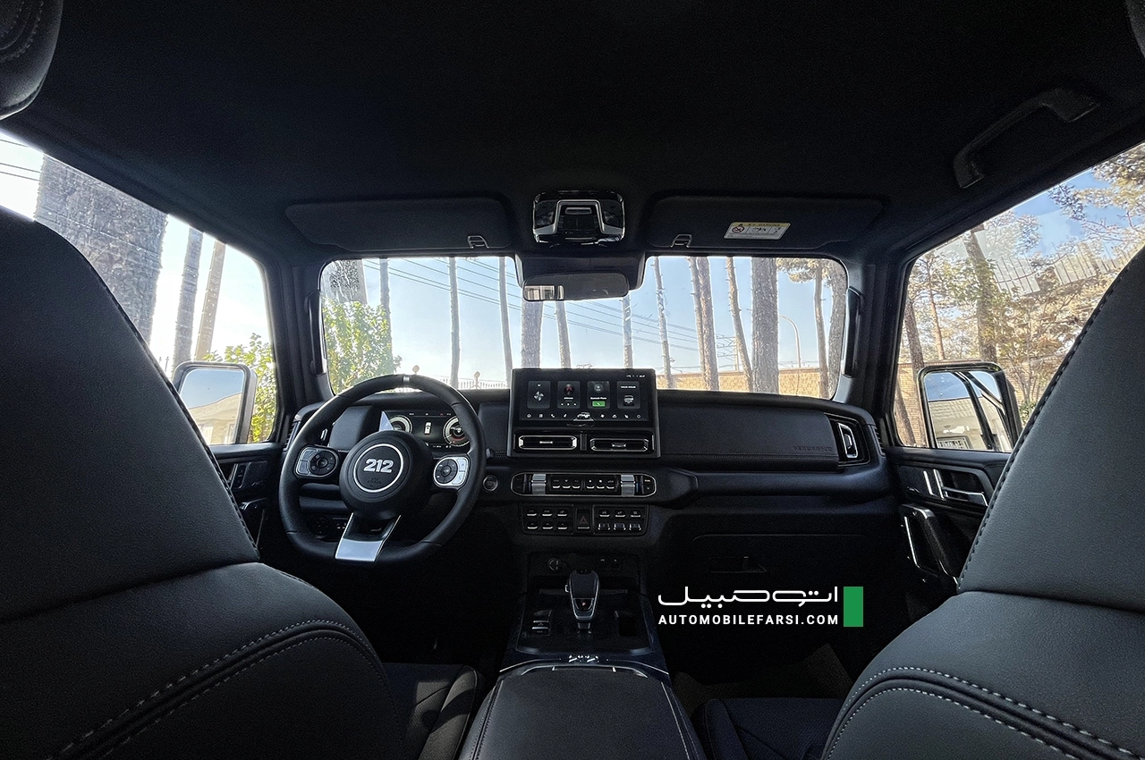 فضای داخلی 212 نویگیتور بهجز در مواردی اندک دقیقاً مشابه نسخه معمولی این خودرو است. طراحی این خودرو با حفظ اصالت آفرودی، حالتی مدرن و کاربردی پیداکرده است. داشبورد با خطوط افقی و سطوح تخت، حس استحکام و قدرت را منتقل میکند و یادآور کابین خودروهای نظامی قدیمی است. این طراحی بیش از هر چیز بر کاربردپذیری و عملکرد تأکید دارد، اما جزئیات دقیق و هماهنگ، تصویری مدرن برای مخاطب امروزی ایجاد کرده است. متریال استفادهشده در کابین بیشتر مقاوم است اما اصلاً حس خشک بودن ندارد. پلاستیکهای باکیفیت در داشبورد و رودریها، همراه با پوششهای چرمی و دوختهای ظریف، تعادلی بین مقاومت و جلوه لوکس ایجاد کردهاند. کف خودرو با پوشش مقاوم در برابر آب و گل، بهویژه برای مسیرهای آفرود طراحیشده و دکمههای فعالسازی قفل دیفرانسیل بهوضوح در دسترس راننده قرار دارند. خودرو 212 با طول بیش از ۴.۷ متر و فاصله محوری نزدیک به ۲.۹ متر، فضای کافی برای سرنشینان ایجاد کرده است. طراحی عمودی پنجرهها و سقف بلند، حس فضای باز و آزادی حرکت را در داخل کابین تقویت میکند و ردیف عقب نیز راحتی مناسبی برای سرنشینان ایجاد میکند این استاندارد طراحی در راستای همان اصالت نظامی این برند است. صندوق بار جعبهای شکل و جادار، گزینهای ایدهآل برای سفرهای طولانی و حمل تجهیزات آفرودی است.