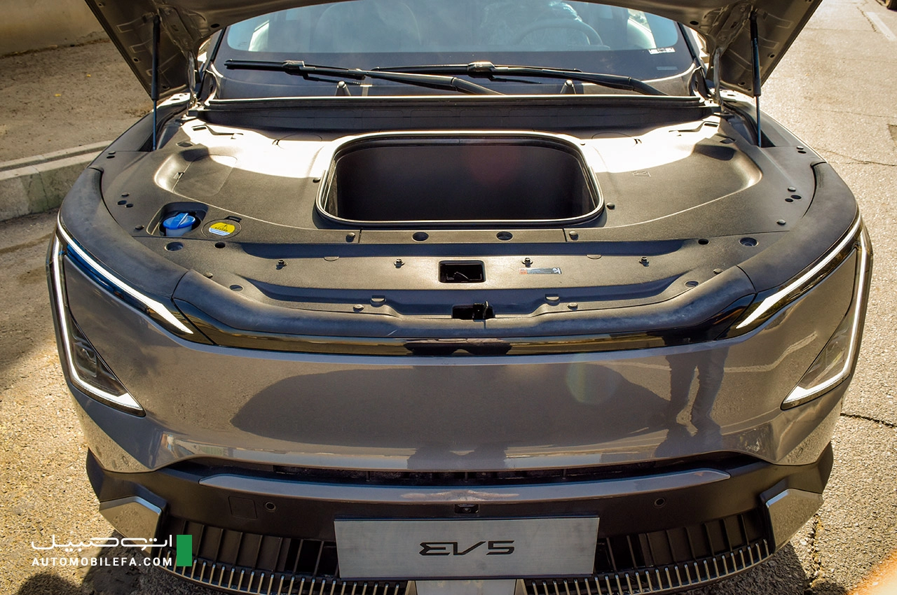 کیا EV5 یک خودرو خانوادگی است و به همین منظور علاوه بر فضای ایده آل داخل کابین، صندوق عقب بسیار بزرگی دارد که قسمت جلویی آن به صورت کشویی رو به بالا می رود تا در سفر ها بتواند نقش میز را بازی کند و از سوی دیگر در فضایی که زیر در موتور قرار گرفته یک محفظه برای قراردادن بار پتا سقف 25 کیلوگرم تعبیه شده است.