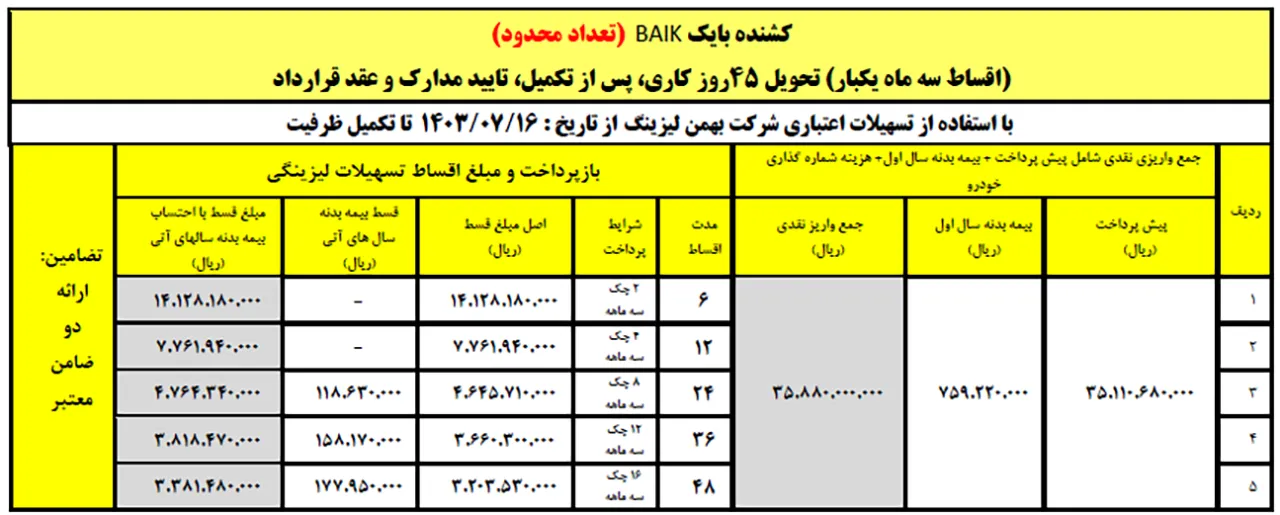 براساس اعلامیه شرکت بهمن لیزینگ، از ۱۶ مهرماه طرح فروش کشنده بایک با اقساط ۶، ۱۲، ۲۴، ۳۶ و ۴۸ ماهه با ارائه دو ضامن معتبر از طریق وبسایت https://bahmanleasing.bahman.ir آغاز میشود. براساس بخشنامه فروش لیزینگی شرکت بهمن دیزل، مبلغ پیشپرداخت کشنده بایک در این طرح ۳ میلیارد و ۵۱۱ میلیون و ۶۸ هزار تومان تعیین شده است که با احتساب نرخ بیمه بدنه ۷۵ میلیون و ۹۲۲ هزار تومانی، این مبلغ به سه میلیارد و ۵۸۸ میلیون تومان تبدیل میشود. تحویل کشنده بایک در این طرح، ۴۵ روز کاری پس از تکمیل مدارک، تایید مدارک و عقد قرارداد خواهد بود. خرید کشنده بایک در طرح فروش لیزینگی نیاز به ارائهدهنده ضامن معتبر دارد. مهمترین نکته در طرح فروش شرکت بهمن دیزل، امکان انتخاب بازپرداخت با چکهای ماهانه، دو ماهه و سه ماهه برای خریداران است.