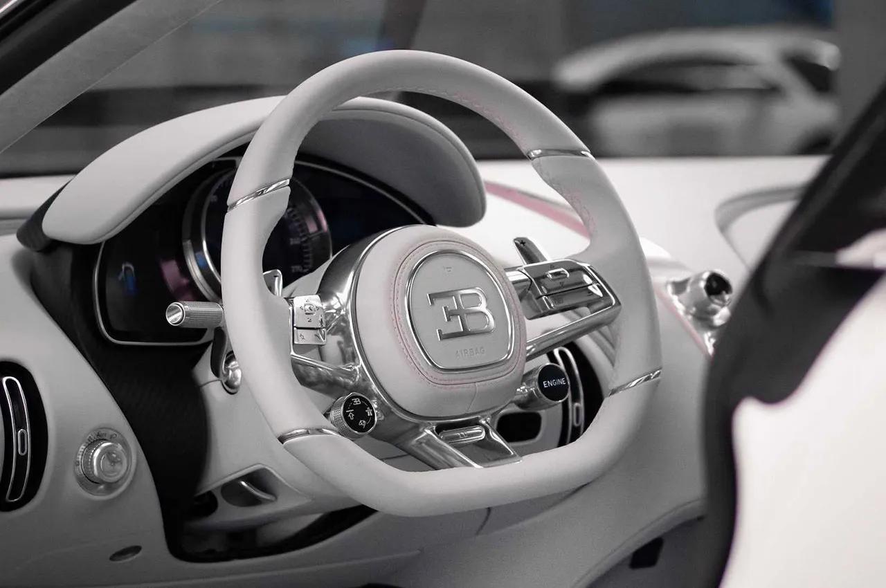 شاهکار بوگاتی با لقب آلیس (برگرفته از نام همسر مشتری ثروتمند) شناخته شده و فرد خریدار آن را از نمایندگی H.R. Owen لندن سفارش داده است. همانطور که در تصاویر مشاهده میکنید، به واسطه رنگ رز ابریشمی و سفید مات، آلیس جلوه خاصی پیدا کرده و بسیار زیبا دیده میشود. بوگاتی میگوید این رنگ جدید بوده و اولین بار است که از آن استفاده میکند.