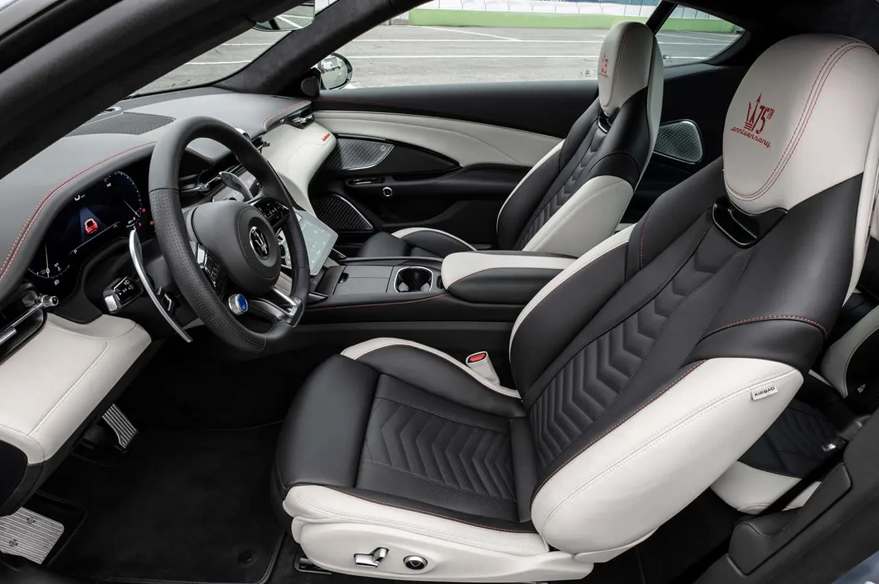 مازراتی برای تزئین کابین گرن توریسمو که با چرم سوراخدار پوشیده شده، از دو رنگ سفید و مشکی با دوخت متضاد قرمز استفاده کرده که آن را میتوان بر روی صندلیها، داشبورد و کنسول میانی مشاهده کرد. روی پشت سری این نمونه لوگو سالگرد 75 سالگی گلدوزی شده تا از نسخه عادی متمایز شود.