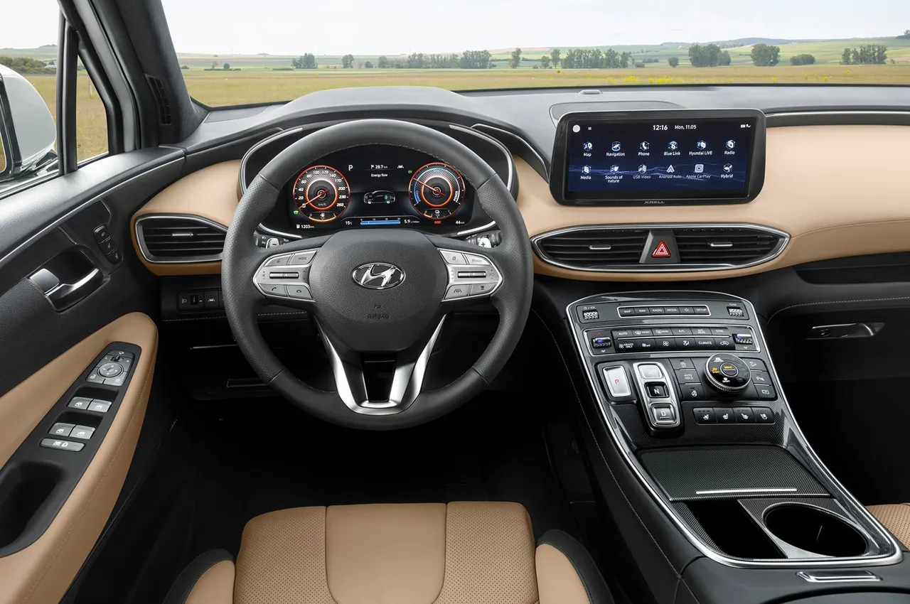 فضای داخل کابین سانتافه جدید نیز مورد بازنگری کامل قرار گرفته است. یک نمایشگر لمسی 10.25 اینچی برای سامانه چندرسانهای (مولتی مدیا) در قسمت مرکزی داشبورد تعبیه شده است. همچنین یک نمایشگر 12.3 اینچی در پشت فرمان وظیفه نشانگرهای سنتی را به دوش میکشد. کنسول مرکزی نیز بسیار متفاوت از گذشته طراحی شده و با شیبی ملایم به سمت عقب کشیده میشود. در این کنسول دکمههایی برای انتخاب حالت پارک، دنده عقب و خلاص به جای اهرم تعویض دنده سنتی در نظر گرفته شده و تمام نسخههای سانتافه 2021 دارای یک اهرم دوار در کنسول مرکزی برای انتخاب حالتهای مختلف رانندگی همچون رانندگی در شن و ماسه، رانندگی در برف و گل، رانندگی اسپرت و حالت کامفورت است تا از سامانه چهارچرخ محرک هیوندای موسوم به HTRAC All-Wheel Drive نهایت استفاده برده شود.