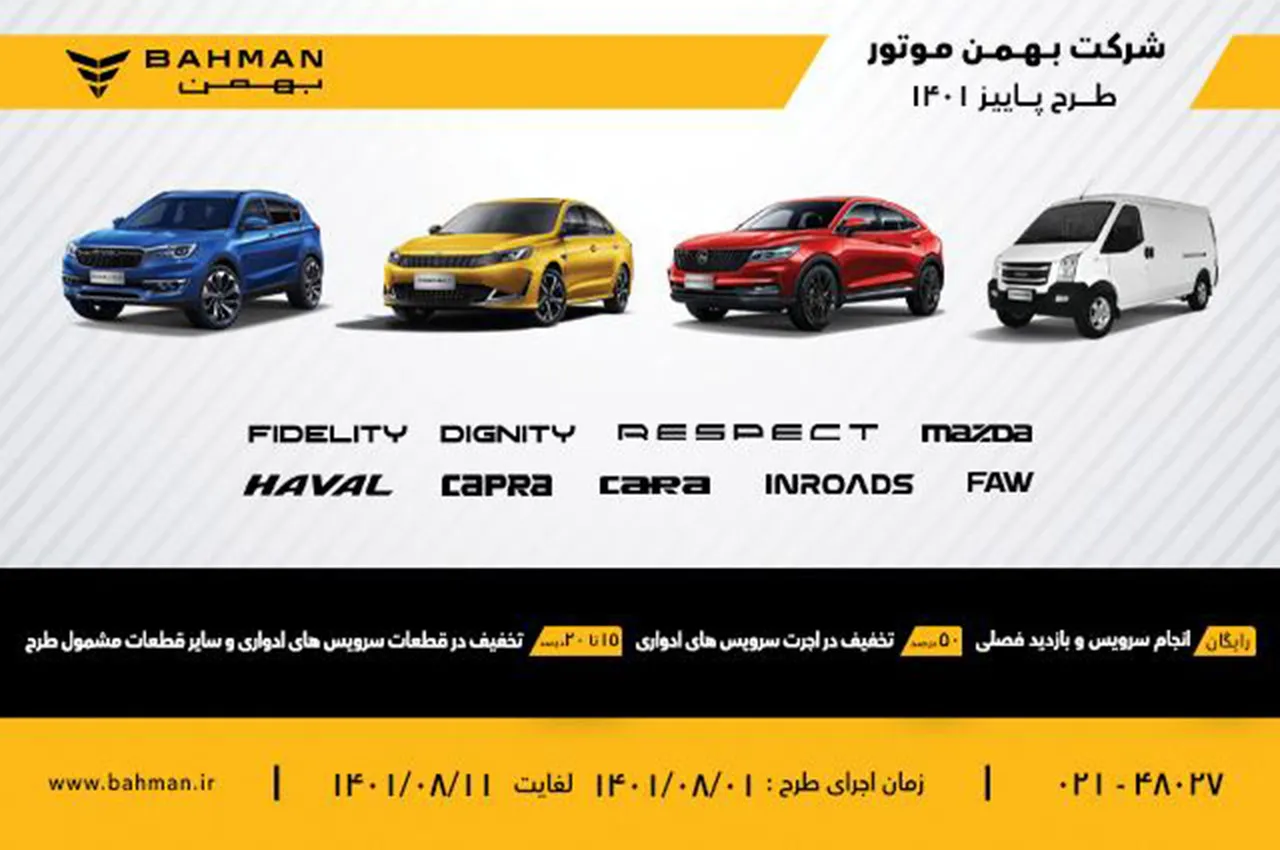 گفتنی است طرحهای خدمات پس از فروش بهمن موتور هر فصل سال اجرا میشود که مالکان محصولات بهمن موتور میتوانند ضمن استفاده از تخفیف، از استهلاک قطعات یدکی مهم خودرو در طولانی مدت جلوگیری نموده و عملکرد خودروی خود را بهبود بخشند. به پنج نفر از مشتریان شرکت کننده در طرح، به قید قرعه بسته هدیه بهمن موتور اهدا میشود.