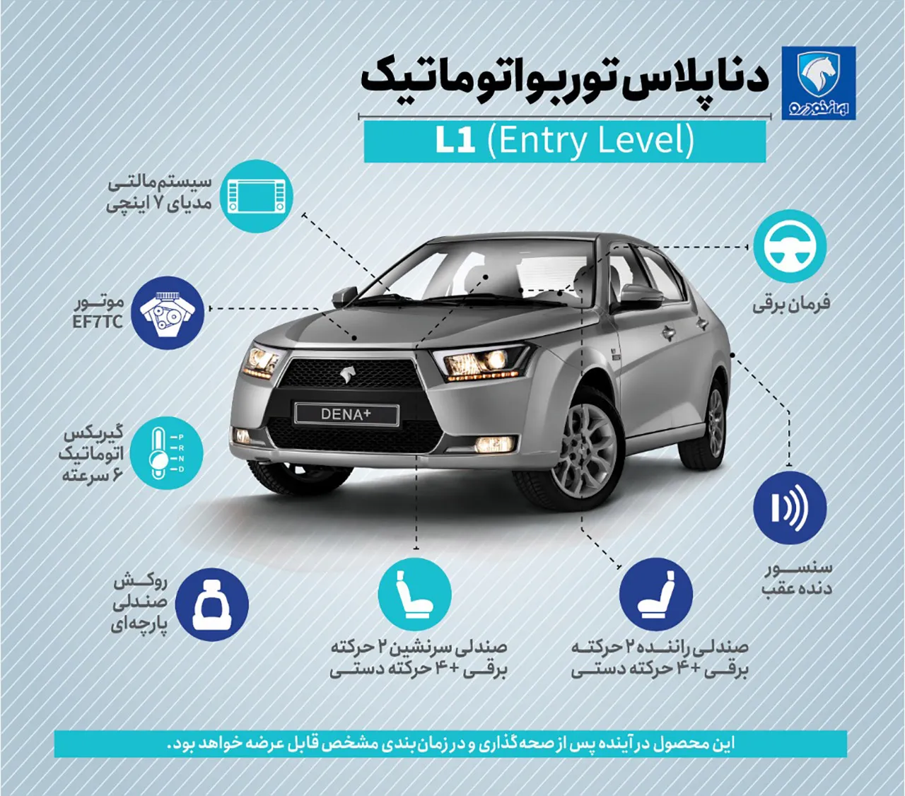 حال بر اساس جدیدترین اخبار منتشر شده از گروه صنعتی ایران خودرو، این شرکت قصد عرضه دنا پلاس توربو اتوماتیک را در تیپهای مختلف دارد. در تصویر زیر تیپ L1 از این خودرو به همراه تجهیزات رفاهی و ایمنی قابل عرضه در این تیپ مشاهده میشود. در این تیپ خبری از روکش چرمی صندلیها، سانروف و دوربین دید عقب نیست!