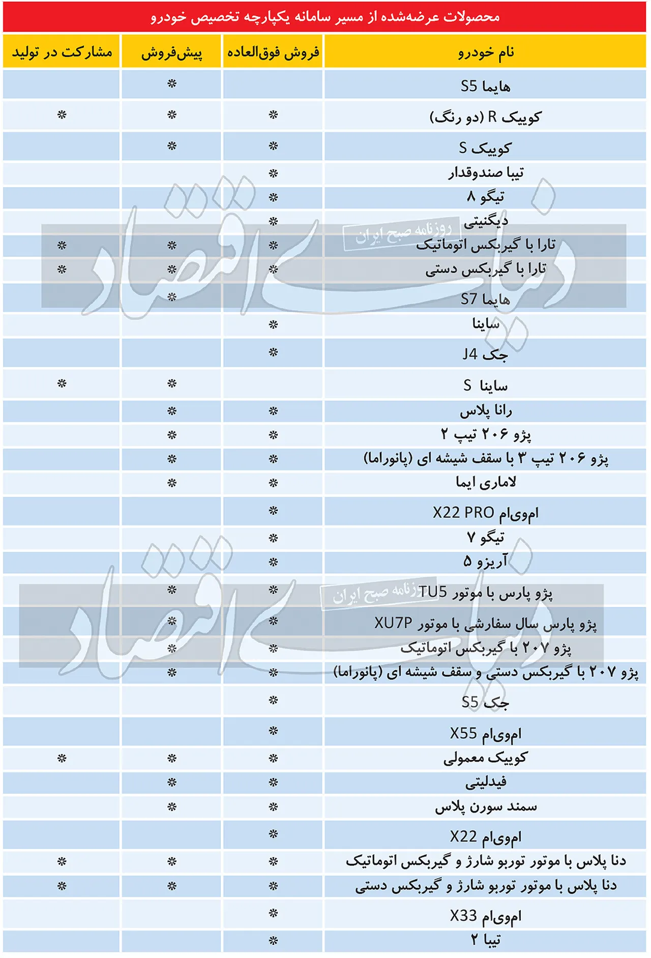 مدیران‌خودرو: شرکت مدیران‌خودرو نیز در این طرح فروش در سامانه یکپارچه، ۹ مدل از محصولات خود شامل MVM X۲۲، MVM X۳۳، MVM X۲۲ PRO، MVM X۵۵، تیگو ۷ IE، تیگو ۷، تیگو ۸ در دو مدل کلاسیک و PRO و همچنین آریزو ۵ توربو را در قالب فروش فوق‌العاده با قیمت قطعی عرضه کرده است.