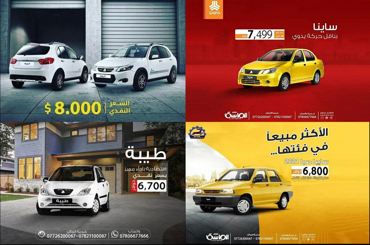 این تصاویر مربوط به آگهی فروش، قیمت و تیزر تبلیغاتی محصولاتی چون ساینا، پراید، تیبا و کوییک بود که نشان دهنده قیمت فروش محصولات سایپا در بازارهای صادراتی همچون عراق است.