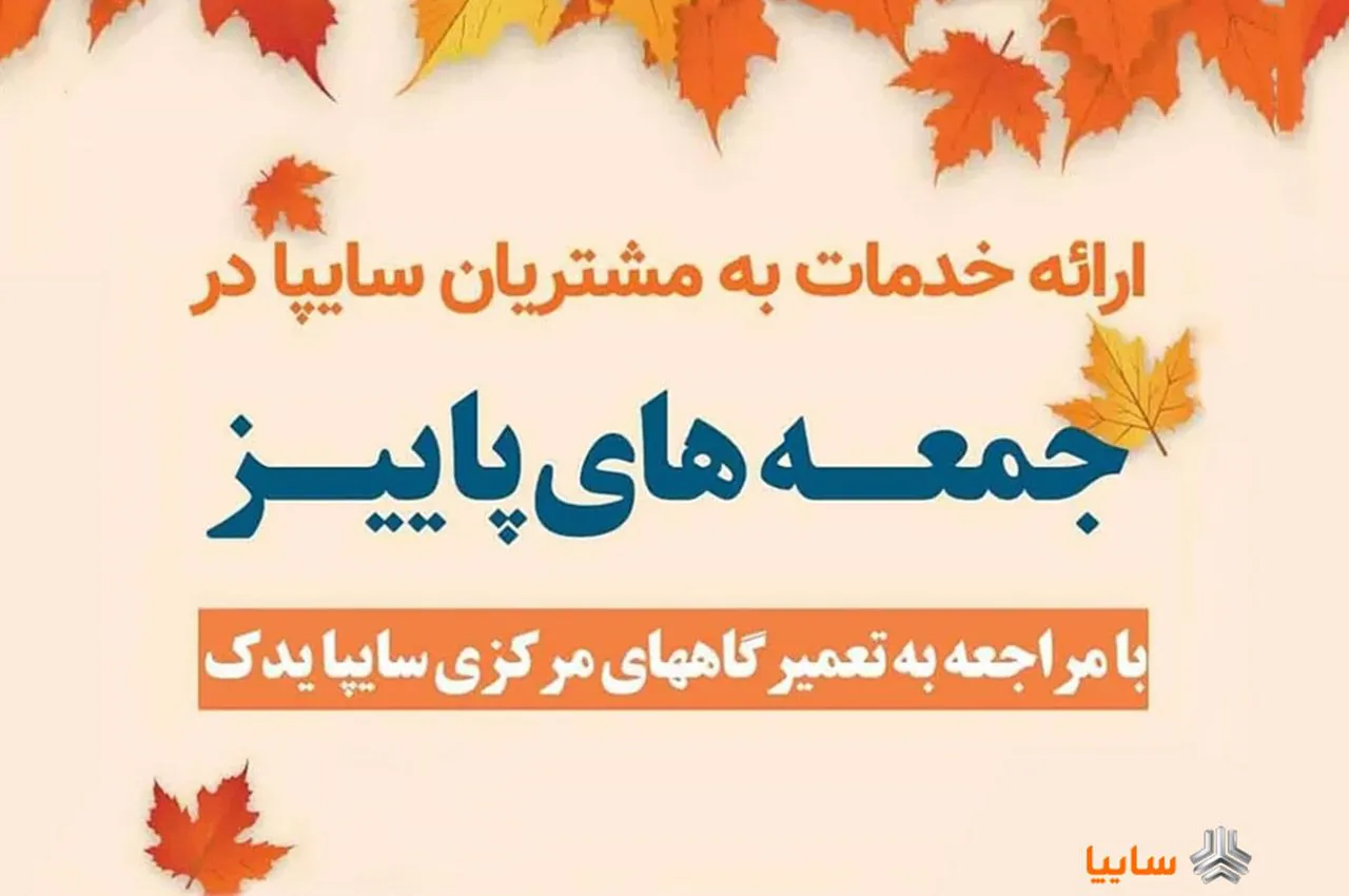 سازمان خدمات پس از فروش سايپا اعلام كرد مشتريان این گروه خودروسازی میتوانند برای انجام سرويس دورهای و دريافت خدمات در طرح جمعههاي پاييز در روزهاي جمعه نيز به تعميرگاه هاي مركزی سايپايدک مراجعه كنند.