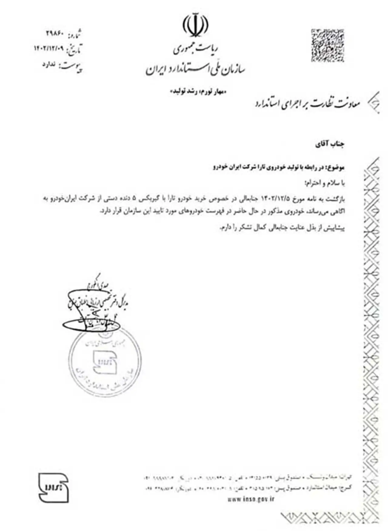 سازمان ملی استاندارد با ارسال نامهای به شرکت ایران خودرو نظر خود را در مورد شمارهگذاری تارا اعلام کرد. در نامه سازمان ملی استاندارد آمده است: تولید و شمارهگذاری تارا دستی با گیربکس 5 سرعته هیچ مشکلی برای تولید و شمارهگذاری در سال جدید ندارد.
