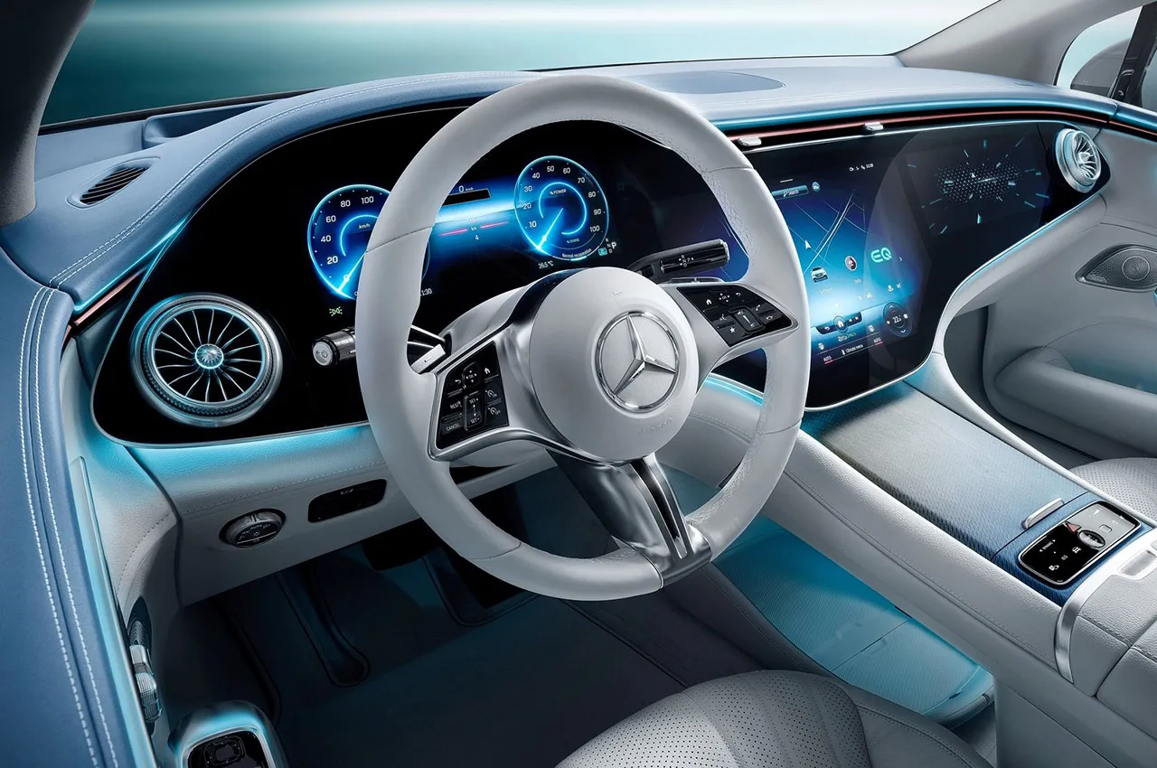 از جذابیتهای فنی و طراحی بدنه مرسدسبنز تمام الکتریکی EQE که بگذریم، نمیتوان از کابین چشمنواز و صفحههای نمایش خارقالعاده به سادگی گذشت. شیشه منحنی 56 اینچی سرتاسر داشبورد کشیده شده و سه نمایشگر بزرگ 17.7، 12.3 و 12.3 اینچی را پوشش میدهد. افزون بر این یک حسگر انگشت برای اهراز هویت رانندهها نیز وجود دارد. از آن جا که اتومبیل مورد بحث یک مرسدسبنز الکتریکی است که آرزوهای بزرگی در سر دارد بدیهی است که مجهز به آخرین دستآوردهای ایمنی این خودروساز بزرگ آلمانی باشد.