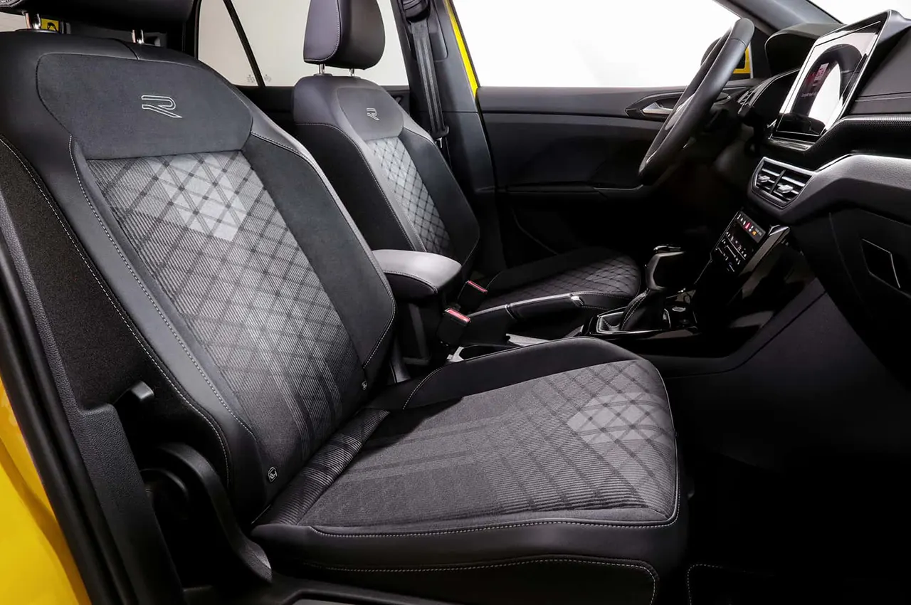 کابین فولکس واگن T-Cross بسته به تریم، از نمایشگر 8 یا 10 اینچ دیجیتال پشت فرمان و 8 یا 9.2 اینچ مرکزی بهره میبرد. این شرکت میگوید، نمایشگر مرکزی از جدیدترین سخت افزار و نرم افزار موجود استفاده میکند تا بهترین تجربه را در اختیار سرنشینان قرار دهد. در تریمهای بالاتر، کنترل تهویه مطبوع با دکمههای لمسی نورانی انجام میشود. ولسبورگیها متریال داخلی را بهبود بخشیدهاند و برای داشبورد فولکس واگن T-Cross از مواد نرم استفاده کردهاند که در تریمهای بالا از دوخت نیز بهره میبرد.