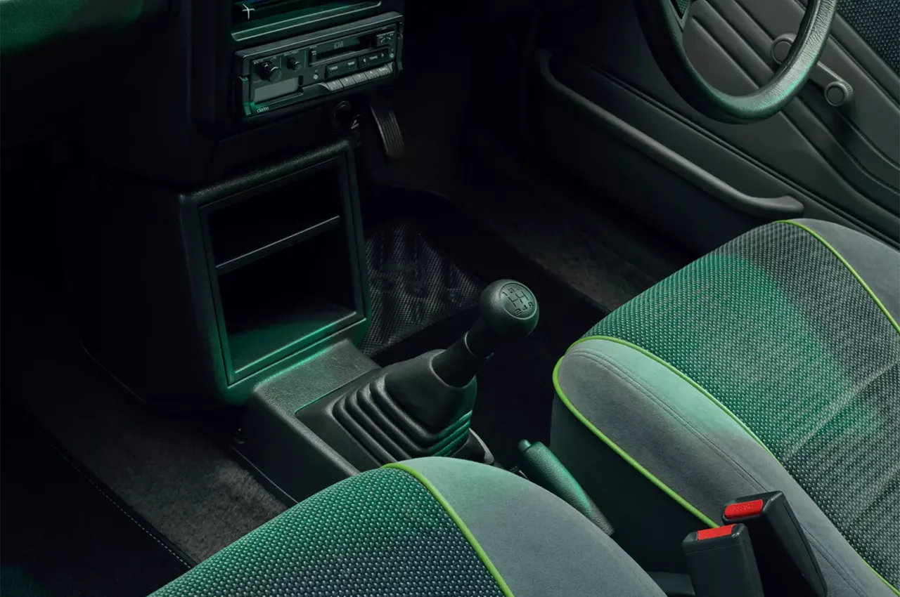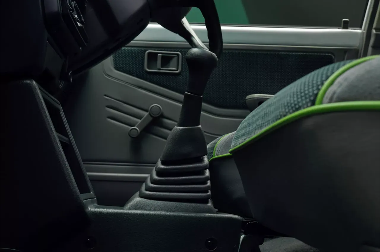 اما همین چرخهای باریک بخشی از جذابیت این خودروی ظاهراً ساده است. حتی جایگاه شارژ نیز زیر درپوش فابریک قرار دارد. بیشتر افرادی که آن را میبینند فکر میکنند که با یک خودروی کاملاً بازسازیشده روبرو هستند، اگرچه تغییرات جزئی هم دارد. یکی از این تغییرات رنگ بدنه است؛ رنگ آبی فلزی اصلی این خودرو با رنگ سفید مرواریدی که در خودروهای الکتریکی مدرن کیا استفاده میشود جایگزین شده است. چراغهای جلو و عقب نیز ارتقاء یافتهاند و داخل خودرو با پارچهای مشابه دوران اصلی بازسازی شده است، اما با دوخت سبز لیمویی به جزئیات داخلی و کالیپرهای ترمز کیا EV6 GT با قدرت ۵۸۵ اسب بخار اشاره دارد. برخلاف بسیاری از خودروهای الکتریکی بازسازیشده، این یکی حتی کلاستر اصلی خود را نیز حفظ کرده است و تکنولوژی DCU Electrogenic نشانگر سوخت را به نشانگر شارژ باقیمانده تبدیل کرده است.