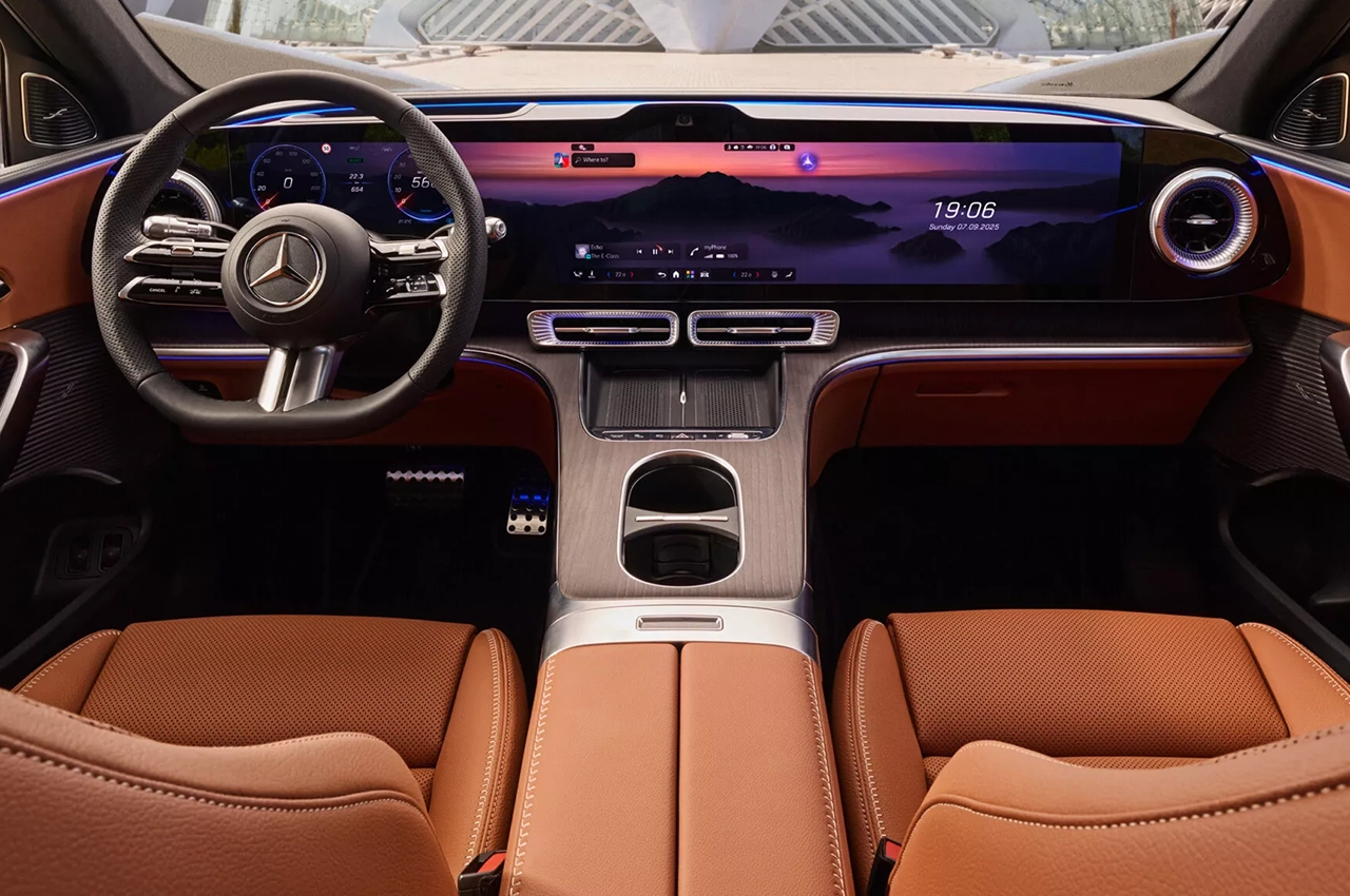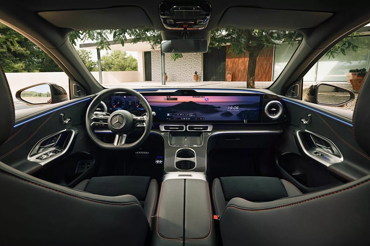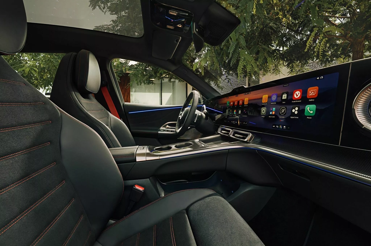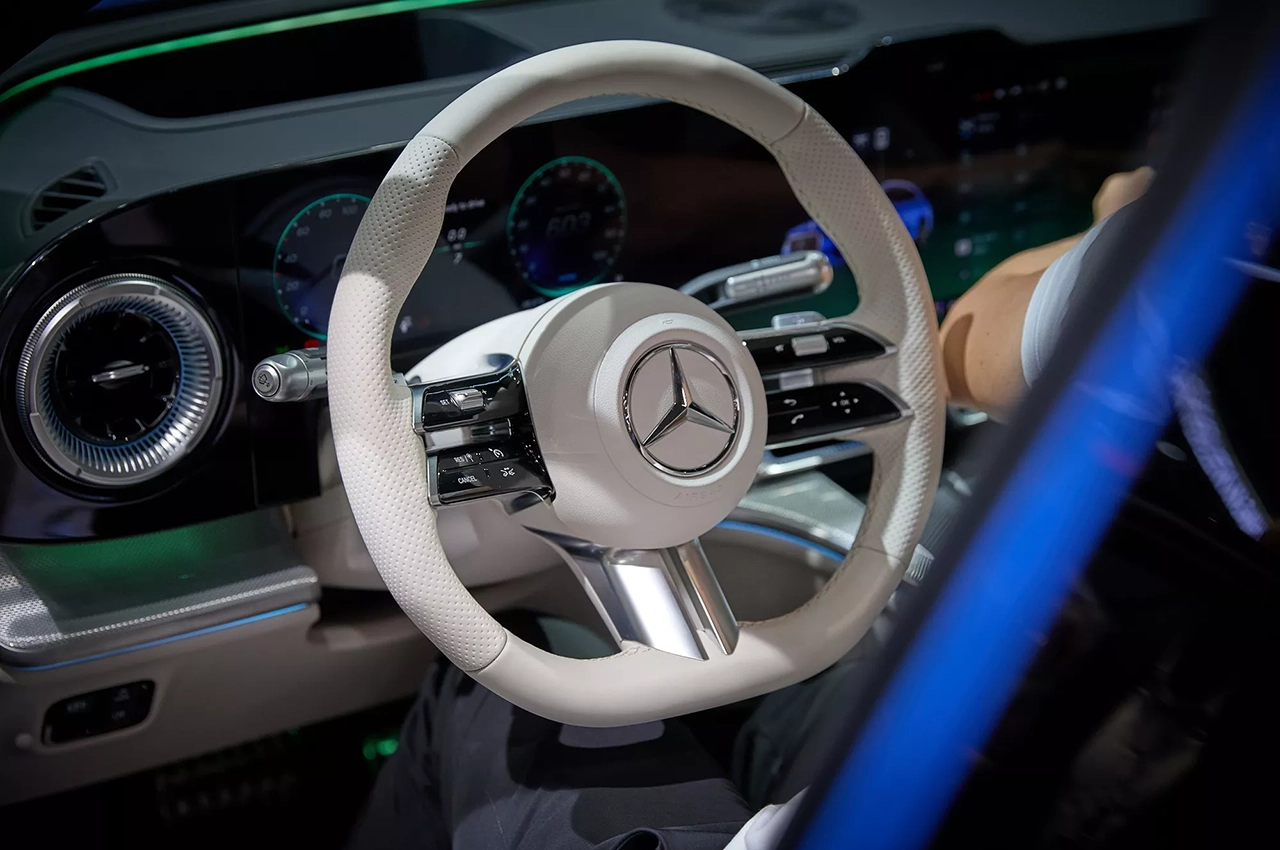 کابین خودرو با فناوریهای پیشرفته تجهیز شده است. یک نمایشگر یکپارچه MBUX Hyperscreen به طول 39.1 اینچ سراسر داشبورد را پوشش میدهد. سیستم نورپردازی محیطی پیچیده و سقف شیشهای پانوراما که میتواند در 9 بخش مجزا از حالت شفاف به مات تغییر کند، از ویژگیهای شاخص هستند. یک گزینه سفارشی با 162 ستاره نورانی در سقف نیز قابل سفارش است که مرسدس آن را تجربهای جادویی توصیف میکند. دریچههای هوای دایرهای در دو طرف نمایشگر و دریچههای مستطیلی در زیر آن قرار دارند. کنسول مرکزی معلق دو جا لیوانی و دو شارژر بیسیم تلفن همراه را در بر میگیرد و کل طراحی داخلی رویکردی مینیمال دارد.