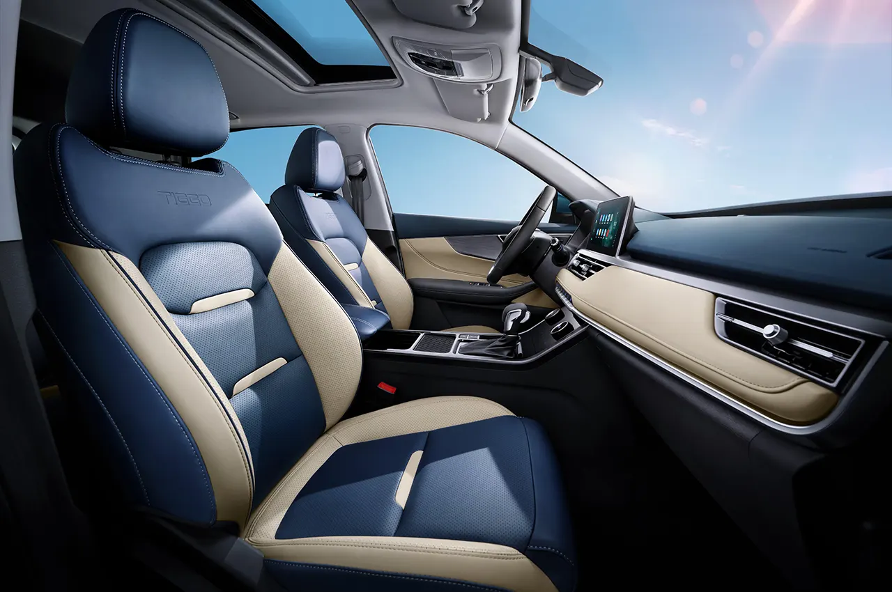 نمای داخلی امویام X55 کراس اما تحولی جدیتری را تجربه کرده است. طراحی داشبورد دقیقا مشابه چیزی است که پیش از این در فونیکس تیگو 8 پرو دیده بودیم، اما مطابق ترند جدید در خودروسازی چین و آنچه در X33 کراس دیده میشود، داشبورد با تم دو رنگ آبی و سفید همراه شده است. به نظر میرسد دو سطح تجهیزاتی برای امویام X55 کراس در نظر گرفته شده که در نسخه پایه، صفحه کیلومتر نیمه آنالوگ و مشابه نمونه کنونی است و در نسخه مجهزتر، دو نمایشگر به هم متصل تعبیه شده که طراحی آن مشابه تیگو 8 پرو است و یکی از نمایشگرها به عنوان صفحه کیلومتر استفاده میشود.