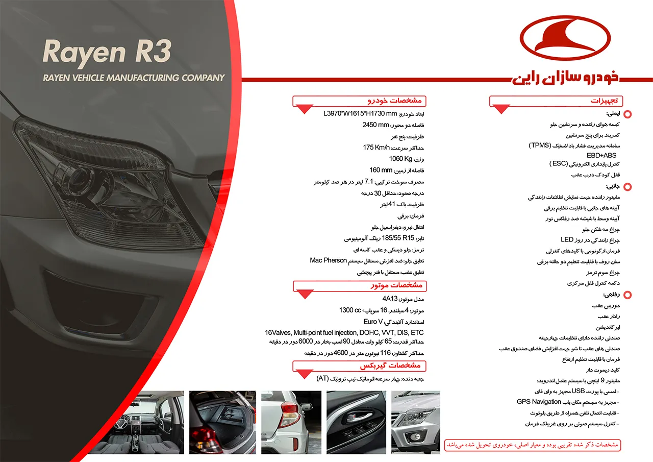 راین R3 یک خودروی هاچبک اتوماتیک است که بنا بر اعلام رسمی شرکت خودروسازان راین با امکانات و آپشنهای مناسب و قیمت رقابتی در 5 رنگ متنوع به زودی وارد بازار خواهد شد. راین R3 دارای طول، عرض، ارتفاع و فاصله بین دو محور به ترتیب 3970، 1615، 1730 و 2450 میلیمتر است و جرم خالص آن نیز 1060 کیلوگرم اعلام شده است.