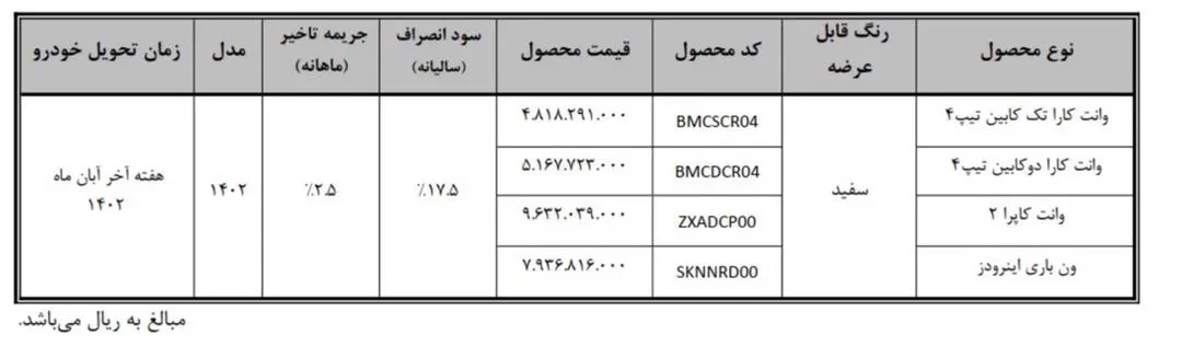 بر همین اساس وانت کارا تک کابین تیپ۴ با قیمت ۴۸۲ میلیون تومان و دوکابین تیپ۴ با قیمت ۵۱۷ میلیون تومان و وانت کاپرا۲ با قیمت ۹۶۳ میلیون تومان و ون باری اینرودز نیز با قیمت ۷۹۴میلیون تومان به فروش میرسد.