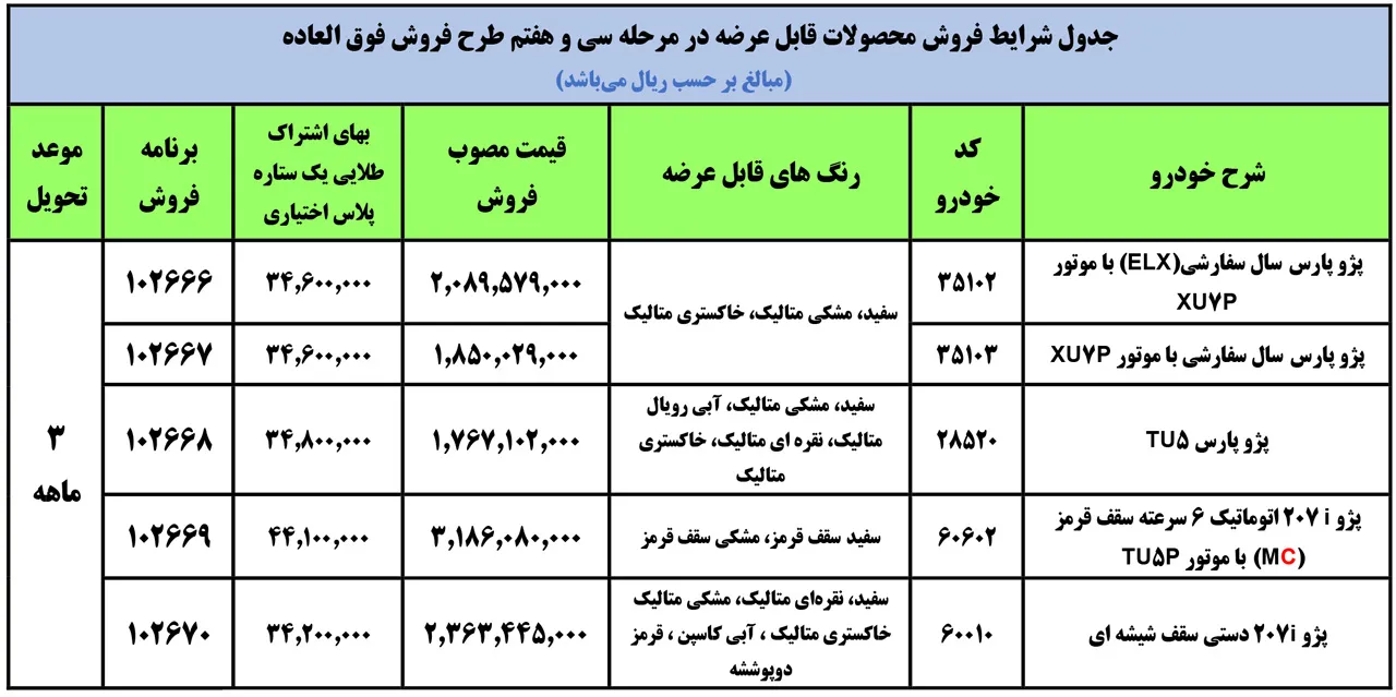 این طرح فروش از روز یکشنبه یازدهم اردیبشهت آغاز و تا پایان روز پنج شنبه پانزدهم اردیبهشتماه ادامه خواهد داشت. در این طرح، پنج محصول پژو پارس سال سفارشی (ELX) با موتور XU۷ پلاس، پژو پارس سال سفارشی با موتور XU۷ پلاس، پژو پارس TU۵، پژو 207i اتوماتیک شش سرعته سقف قرمز (MC) با موتور TU۵ پلاس و پژو 207i دستی سقف شیشهای، به روش قرعه کشی و با موعد تحویل سه ماهه، عرضه خواهد شد.
