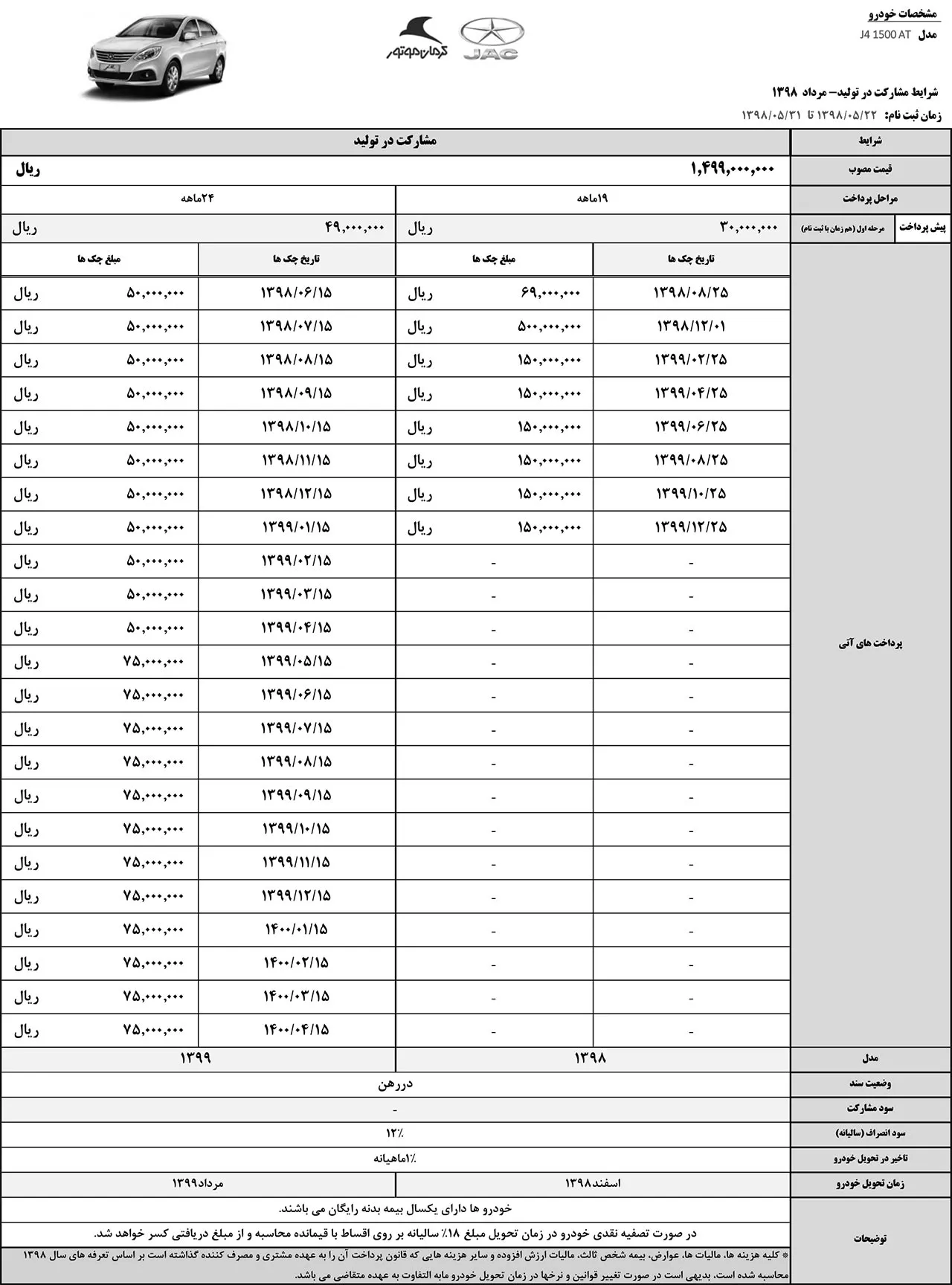 در این شرایط مشارکت در تولید، هر سه محصول با اقساط بدون بهره 19 و 24 ماهه عرضه خواهند شد و تحویل خودروهای ثبتنامی نیز در اسفند98 و مرداد ماه 99 صورت خواهد گرفت. برای مشتریانی که در زمان تحویل، مبلغ کامل خودرو ثبتنامی را تسویه کنند تخفیف 18 درصد به صورت سالانه در نظر گرفته خواهد شد.