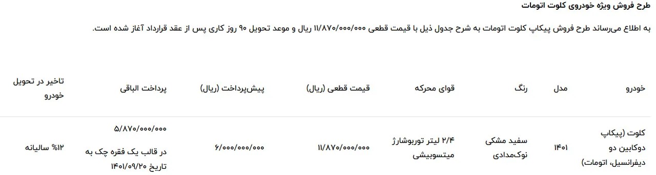 طبق این طرح متقاضیان در زمان ثبتنام مبلغ 600 میلیون تومان را پرداخت کرده و الباقی بهای خودرو برابر با 587 میلیون تومان را در قالب یک چک به تاریخ 20 آذرماه 1401 پرداخت میکنند. موعد تحویل کلوت اتومات نیز 90 روز کاری خواهد بود.