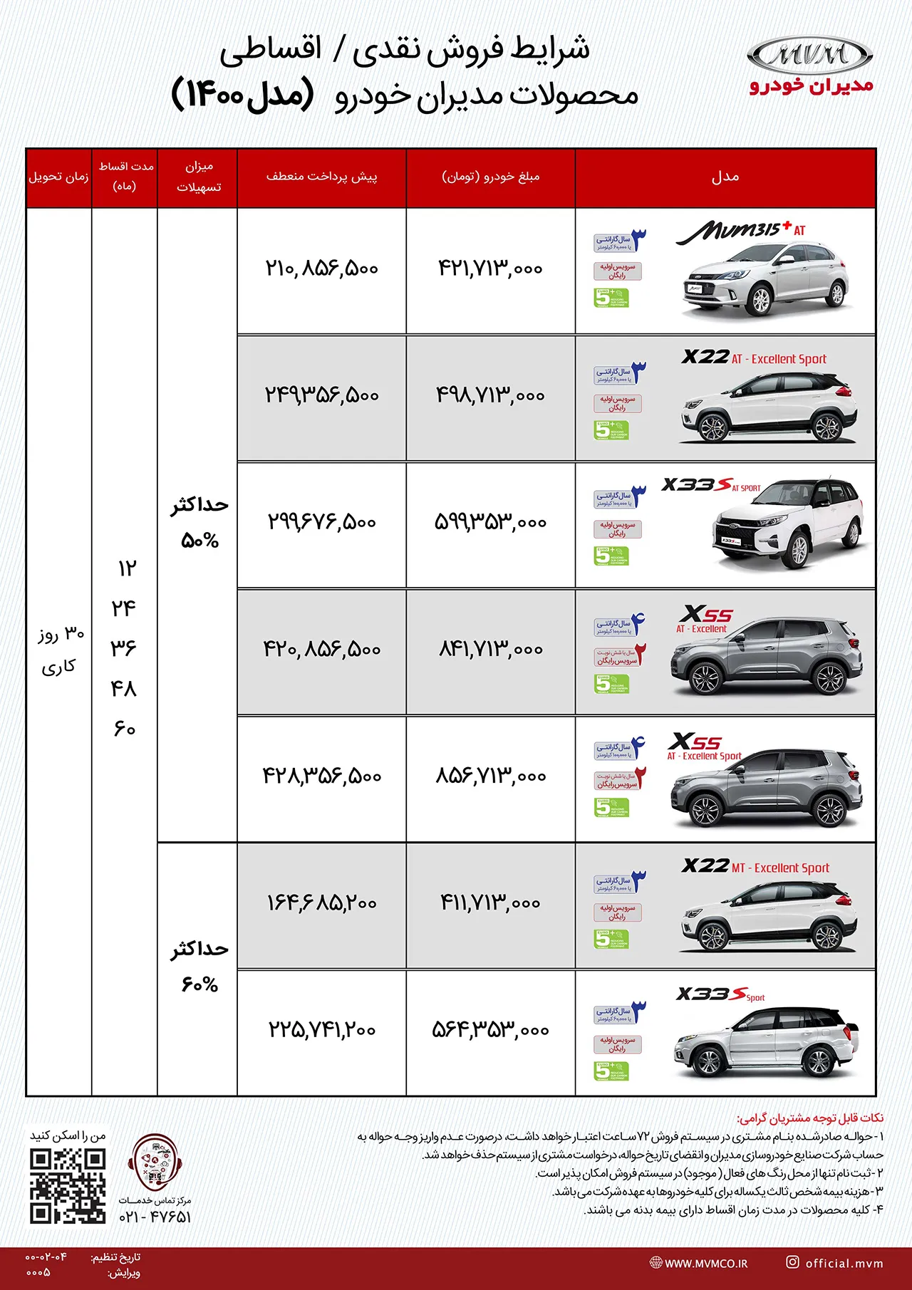 شرکت مدیران خودرو شرایط فروش جدید نقدی و اقساطی محصولات خود را با مدل 1400 اعلام کرد.