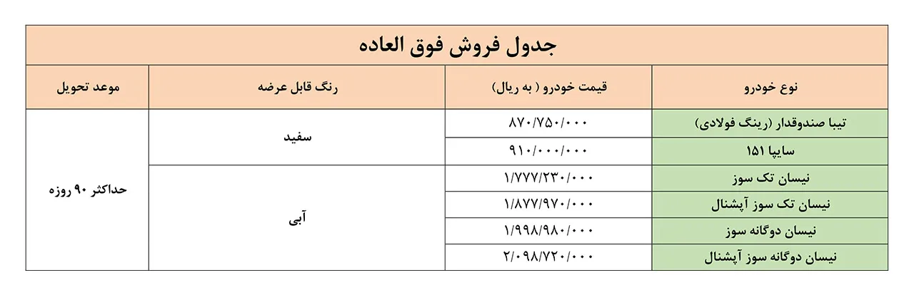 گروه خودروسازی سایپا طرح فروش فوقالعاده جدید محصولات خود را ویژه دی ماه 99 اعلام کرد. این طرح از ساعت 10 صبح روز پنجشنبه 25 دی ماه 99 آغاز و به مدت 3 روز به صورت شبانه روزی ادامه خواهد داشت. سایپا در این طرح 6 محصول خودر شامل تیبا با رینگ فولادی، وانت 151، وانت نیسان تک سوز، وانت نیسان تک سوز آپشنال، وانت نیسان دوگانه سوز و وانت نیسان دوگانه سوز آپشنال را با موعد تحویل 90 روزه عرضه کرده است.