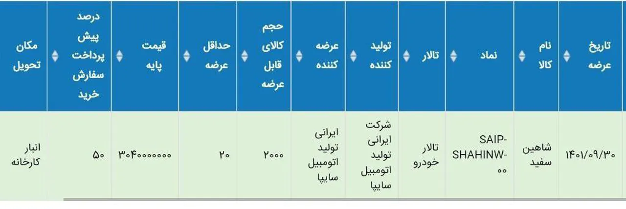 گروه خودروسازی سایپا در نظر دارد تعداد 2000 دستگاه خودرو شاهین را از طریق بورس کالا در تاریخ چهارشنبه 30 آذرماه 1401 عرضه نماید. قیمت پایه در این معامله در جدول زیر آمده است.