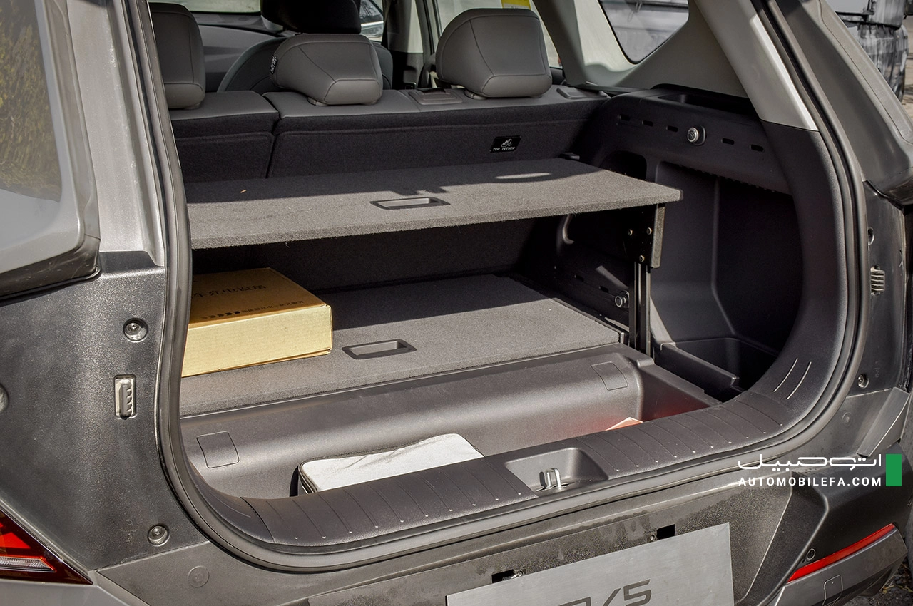 کیا EV5 یک خودرو خانوادگی است و به همین منظور علاوه بر فضای ایده آل داخل کابین، صندوق عقب بسیار بزرگی دارد که قسمت جلویی آن به صورت کشویی رو به بالا می رود تا در سفر ها بتواند نقش میز را بازی کند و از سوی دیگر در فضایی که زیر در موتور قرار گرفته یک محفظه برای قراردادن بار پتا سقف 25 کیلوگرم تعبیه شده است.